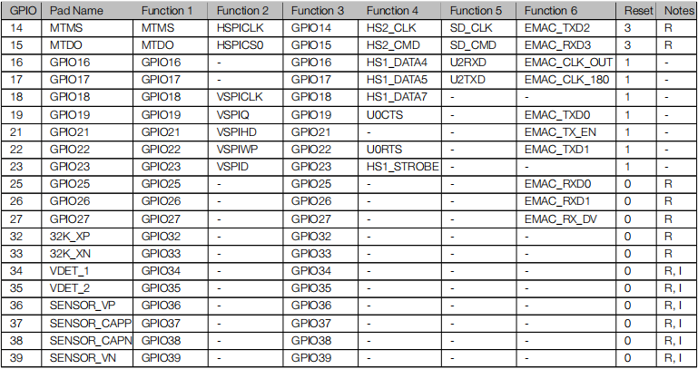 注意:其中 GPIO 34-39 仅用作输入管脚,其他的既可以作为输入又可以作为输出管脚。
