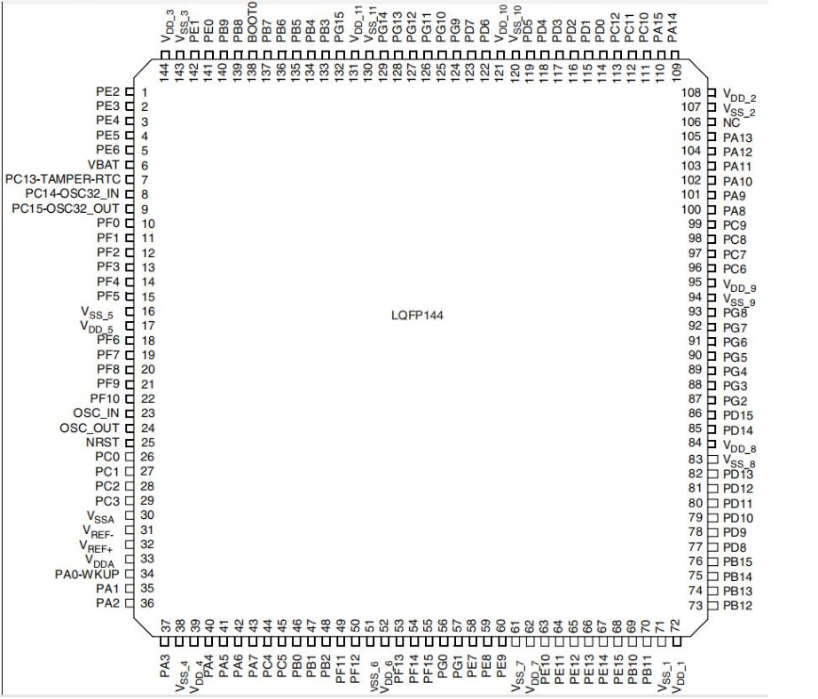 - 电源管脚: 引脚图中的 VDD、VSS、VREF+、VREF-、VSSA、VDDA 等都属于电源引脚。