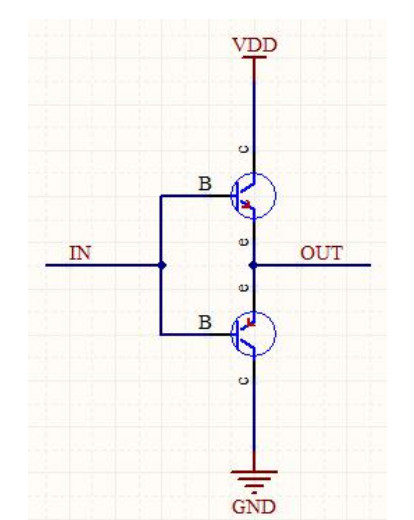 - 在该单元输入一个低电平时,P-MOS 管截止,N-MOS 管导通,对外输出低电平(0V)。