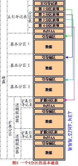 (2)0x1be-0x1fd:DPT分区表,64字节,每16字节描述一个分区,所以硬盘的主分区+扩展分区不能大于4个,另外扩展分区数不能大于1。(现实中,不止4个,其实是扩展分区里面分出来的逻辑分区,对于逻辑分区的问题上面的链接也有提到,可以参考。)