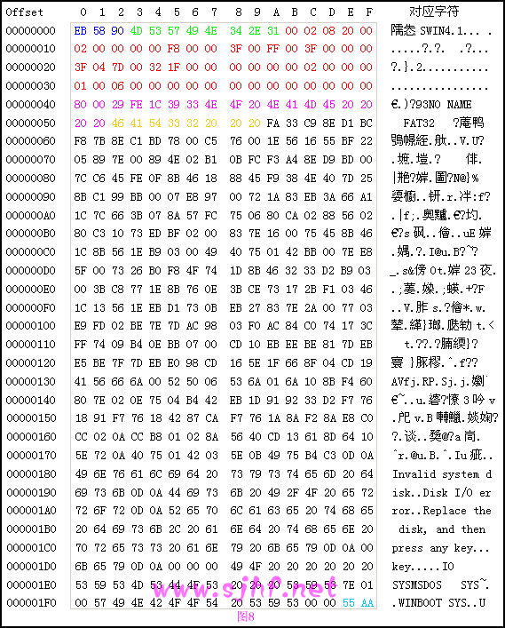 DBR(Dos Boot Record):即操作系统引导记录,通常位于分区的第0个扇区,共512个字节(特殊情况也要占用其它保留扇区)。在这512个字节中,其实又是由跳转指令,厂商标志和操作系统版本号,BPB(BIOS Parameter Block),扩展BPB,os引导程序,结束标志几部分组成。 以用的最多的FAT32为例说明分区DBR各字节的含义。见图: