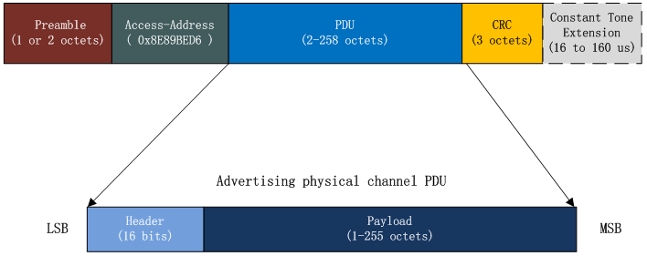 广播包的组成呢,也遵循上一节讲的数据包的基本组成方式(BLE(3)—— 空口数据包组成),只不过 AA 变为了特定值(0x8E89BED6),PDU 赋予了它新的生命: