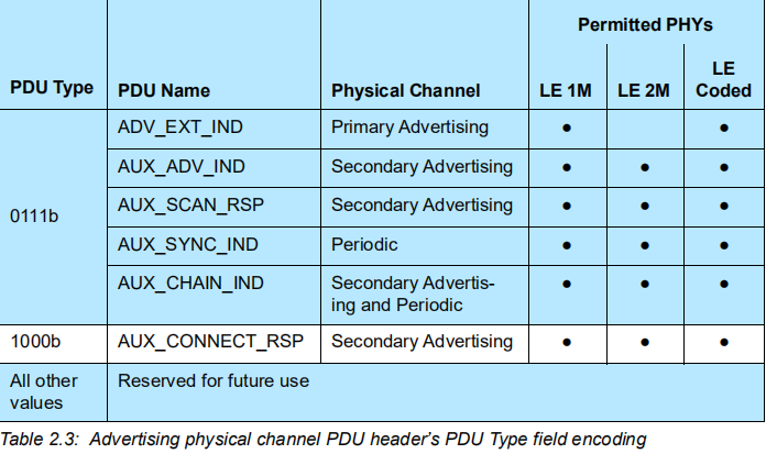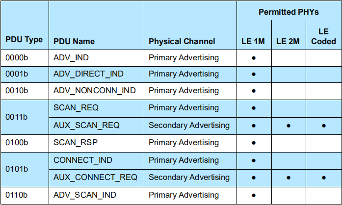 Alright,下图表示了 PDU Type 不同,所对应的包的不同,以及他们的 Physical Channel,甚至于支持的 PHYs: