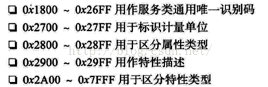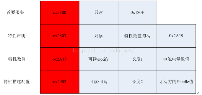 1.对于电池服务这个属性,其属性类型是ATT_DECL_PRIMARY_SERVICE(0x2800),属性值是访问可读和蓝牙标准组织规定的0x180f(位于0x1800到0x26ff之间);