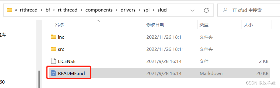 关于SFUD的readme文件目录:E:rtthreadbfrt-threadcomponentsdriversspisfud