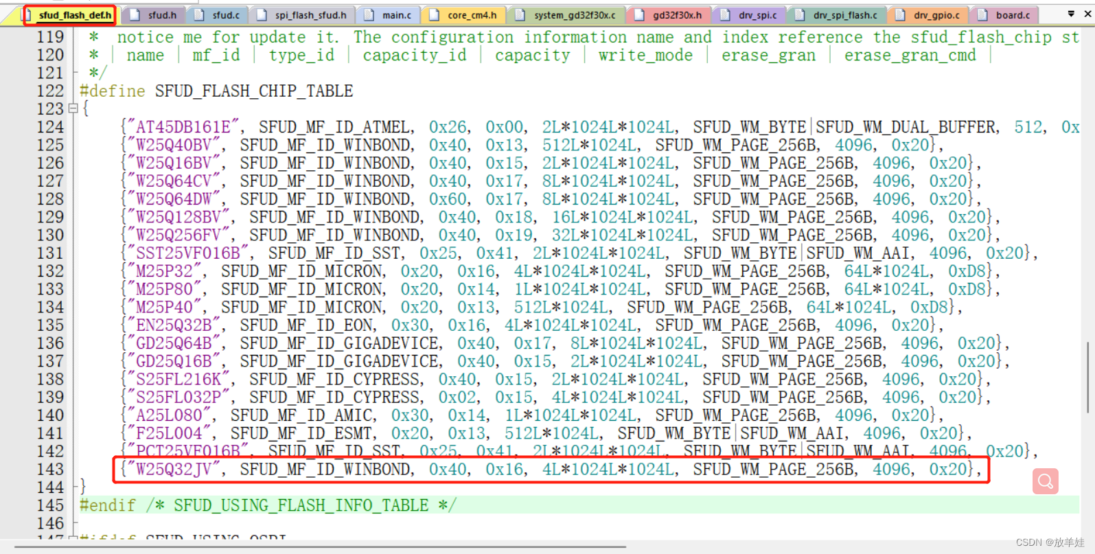 再将其增加到 `SFUD_FLASH_CHIP_TABLE` 宏定义末尾,即可完成该库对 `GD25Q64B` 的支持。