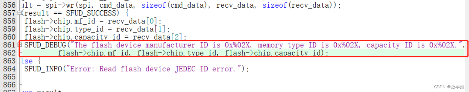 将会调用 `sfud_device_init` ,初始化 Flash 设备表中的全部设备。如果只有一个 Flash 也可以只使用 `sfud_device_init` 进行单一初始化。