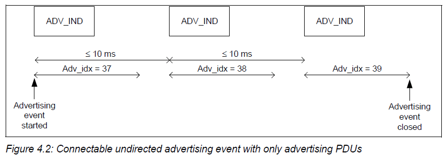 鉴于此种广播类型用的最多,下面我们来讨论一下此类型下广播事件中广播包的发送情况,另外要注意在一个广播事件中,前一个“ADV_IND PDUs”的开始到相邻的下一个“ADV_IND PDUs”的开始处的时间要小于等于 10ms :