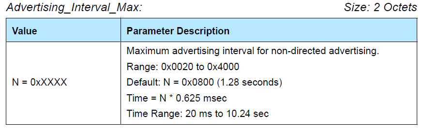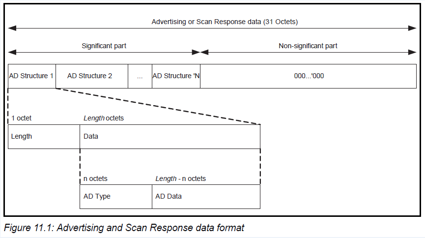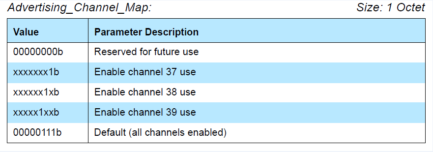 以上就是苗条月亮最近收集整理的关于BLE 基础知识广播Advertising interval (广播间隔)Advertising_Type (广播类型)Own_Address_Type (自身地址类型)Direct_Address_Type (定向地址类型)Direct_Address (定向地址)Advertising_Channel_Map (广播信道)Advertising_Filter_Policy (广播过滤策略)Advertising And ScanReponse Data (广播和扫描回应数据)的全部内容,更多相关BLE内容请搜索靠谱客的其他文章。