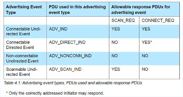 注意:所谓的定向和非定向针对的是广播的对象,如果是针对特定的对象进行广播(在广播包PDU中会包含目标对象的MAC)就是定向广播,反之就是非定向。可连接和不可连接是指是否接受连接请求,如果是不可连接的广播类型,它将不回应连接请求。可扫描广播类型是指回应扫描请求。