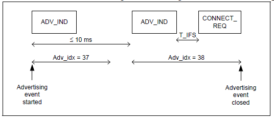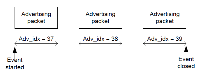 在一个广播事件中,广播包会分别在三个广播通道中被发送一次 (37, 38, 39)