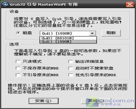 这里要说明一下,在“设备”里有两个选项,一个是电脑的硬盘,一个是要制作的U盘。这里一定要选对U盘而别选错硬盘,从大小就能分出来哪个是U盘。笔者的U盘是2G的,所以应该选择(hd1)[1898M]。下面的“选项”部分可以不用管,默认不勾选任何参数就行。确认好以上步骤后,点“安装”然后进行下一步。