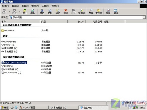 我们看到,在用虚拟光驱载入系统镜像后,“我的电脑”目录里多了一个GHOSTXP-6.5NTFS的驱动器盘符。这就是我们即将要安装的系统所在位置。