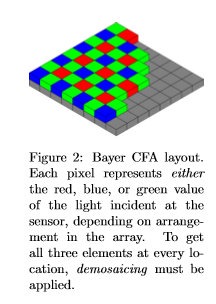 RAW传感器数据通常以彩色滤光片阵列(CFA)的形式出现。 这是一个m×n的像素阵列(其中m和n是传感器的尺寸),其中每个像素都承载有关单个颜色通道(红色,绿色或蓝色)的信息。 由于落在CCD中任何给定光电传感器上的光在电容器中记录为一定数量的电子,因此只能保存为标量值。 单个像素无法保留可观察光的3维性质。 CFA是一个折衷方案,它通过放置在每个像素上方的光谱选择滤镜在不同位置捕获有关三个颜色通道的信息。 虽然您可能只真正知道任何像素位置处的一种颜色值,但是可以巧妙地从附近已知这些颜色的邻居处插入其他两种颜色值。 此过程称为去马赛克,并在彩色数字图像中通常期望的每个像素位置生成RGB值的mby-n-by-3数组。
