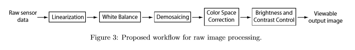 为了在MATLAB中处理和显示来自传感器数据的图像,我们必须考虑上述原始数据的性质。图3中描述的工作流是如何从原始传感器数据中获得“正确的”可显示输出图像的一级近似。第4节将介绍如何在MATLAB中实现它,但这也可以被认为是使用任何编程语言的一般方法。