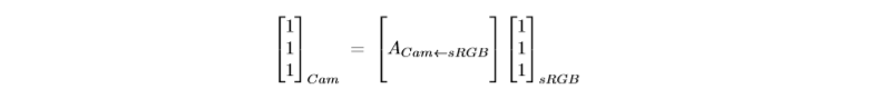 dcraw中发现的另一个必要技巧是,首先对sRGB-to-Cam矩阵的行进行规范化,以使每一行的总和为1。尽管它看起来是任意的,而且有些特殊,但我们可以看到,如果 我们考虑将相机色彩空间中的白色像素转换为输出空间中的白色像素时会发生的情况:我们可以说它仍应为白色,因为我们已经应用了白平衡倍增器。 由于两个空间中的白色均由RGB坐标1 1 1 T表示,因此我们必须对行进行归一化,以便