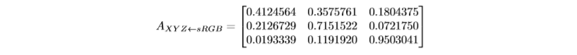 用于输出到xyz颜色空间转换的矩阵可以在Bruce Lindbloom的综合网站[8]中找到。为了方便起见,这里给出了最常用的从sRGB空间到XYZ空间的矩阵。