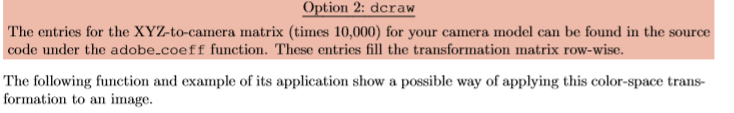 可能难以找到要应用的正确矩阵。 dcraw本身使用矩阵(从Adobe中收集),这些矩阵从相机的色彩空间转换为XYZ色彩空间,这是一种常见的标准。 然后,可以应用从XYZ到所需输出空间(例如sRGB)的转换。 更好的是,这两个转换可以先组合然后应用一次。