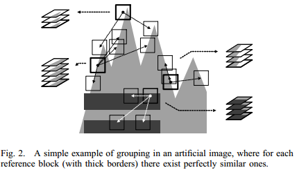 BM3D如何找到相似图像块组织3D分组:如下图所示,正方形所示为各个图像块,左上的分组所选取的图像块都具有角点(尖点)特征,其他分组类似。