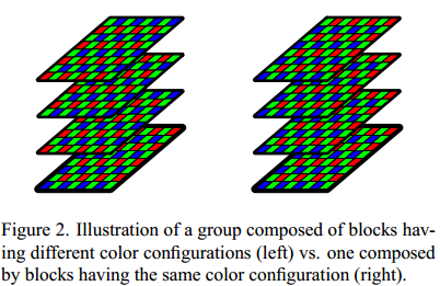 BM3D如何在CFA中进行处理:如下图所示,左边的分组里面的图像块具有不同的彩色配置,即R,G,B的排列方式不是一致的,而右边具有相同的彩色配置,所以其对于处理CFA图像是非常合理的。