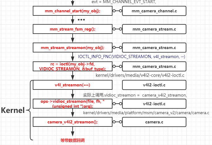 通过ioctl的方式,经过层层调用,最后调用到camera_v4l2_streamon();
