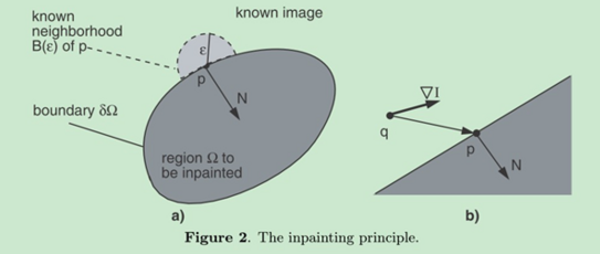 现在假设p点是我们要修复的像素。以p为中心选取一个小邻域B(ε),该邻域中的点像素值都是已知的(只要已知的)。(这个ε就是opencv函数中参数 inpaintRadius)