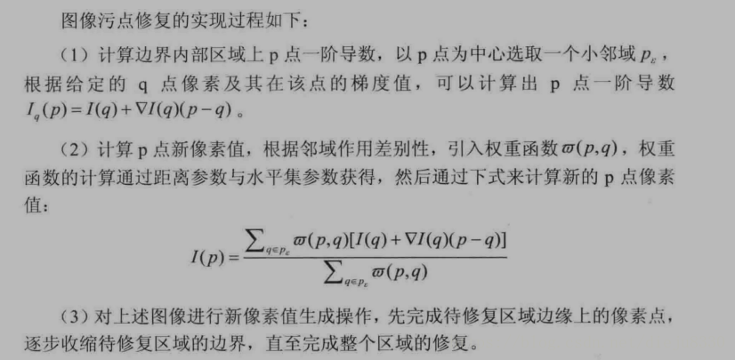参考上图,Ω区域是待修复的区域;δΩ指Ω的边界);要修复Ω中的像素,就需要计算出新的像素值来代替原值。