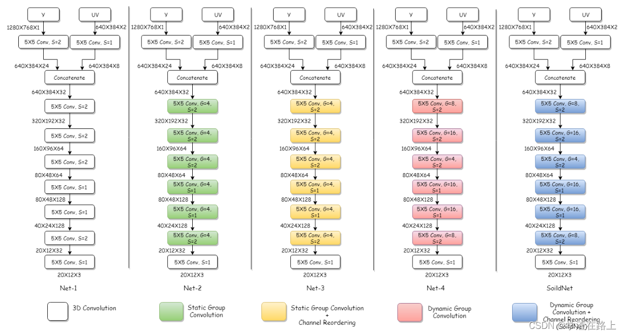 为了完成低功耗汽车 SoC 的污染退化检测任务,首先设计了一个基础网络(Net-1)以 YUV420 平面格式输入,其中 Y、U 和 V 通道的尺寸分别为 1280×768、640×384 和 640 ×384。 由于 Y 和 UV 之间的维度不匹配,因此该网络设计为采用两个输入,一个用于 Y,另一个用于 UV。 稍后通过卷积操作,将两组特征图(Y 和 UV)降低到相似的维度并连接起来,使网络成为单一流。 这种方法可以在[13]中详细检查。 如图 3 所示,Net-1 被进一步重构为 4 个其他网络(Net-2、Net-3、Net-4 和 SoildNet),以获得轻量级和更高效的 Net-1 的最佳变体。 网络重构是使用下一节中讨论的组卷积和通道重新排序来完成的。