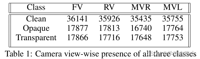 对于报告的问题,正确预测干净tile更为关键。这是因为,大量误报将导致更频繁地清洁已经清洁的摄像机。因此,水箱需要反复加油。因此,使模型适度偏向干净类是有意义的。在本实验中,总共使用了144053个样本图像,其中70000个样本是纯清洁图像,这意味着所有tile都没有脏污。更高数量的干净样本将有助于学习干净类的更好区分特征,因此模型倾向于倾向于干净。摄像机之间的样本分布如下,FV:36259;RV:36160,MVR:35435;MVL:36199。在输入分辨率为1280×768的情况下,尺寸为64×64的瓦片沿宽度方向形成20个tile,沿高度方向形成12个瓦片。因此,单个样本总共包含20×12个tile,基于tile的类分布为干净:25459238;不透明:6341435;透明:2772047。摄像机视图的更改会显著影响对象的外观,因此有必要检查这些类在不同摄像机视图之间的平铺层上的分布情况。表1显示了这些类在所有四个摄像机视图中充分分布。