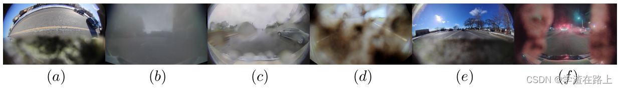 图 2:不同类型的污渍:(a) 草,(b) 雾,(c) 雨滴,(d) 泥土,(e) 泥浆飞溅,(f) 夜间泥浆飞溅