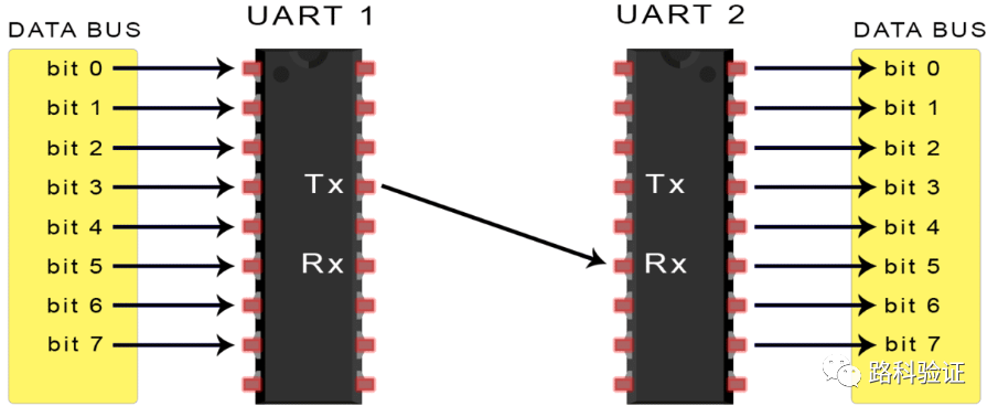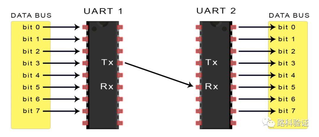 将要发送数据的UART从数据总线接收数据。数据总线用于通过其他设备(例如CPU、内存或微控制器)将数据发送到UART。数据以并行形式从数据总线传输到发送UART。发送UART从数据总线获取并行数据后,它将添加起始位、奇偶校验位和停止位,以创建数据包。接着,数据包在Tx引脚上逐位串行输出。接收UART在其Rx引脚上逐位读取数据包。然后,接收UART将数据转换回并行形式,并删除起始位、奇偶校验位和停止位。最后,接收UART将数据包并行传输到接收端的数据总线: