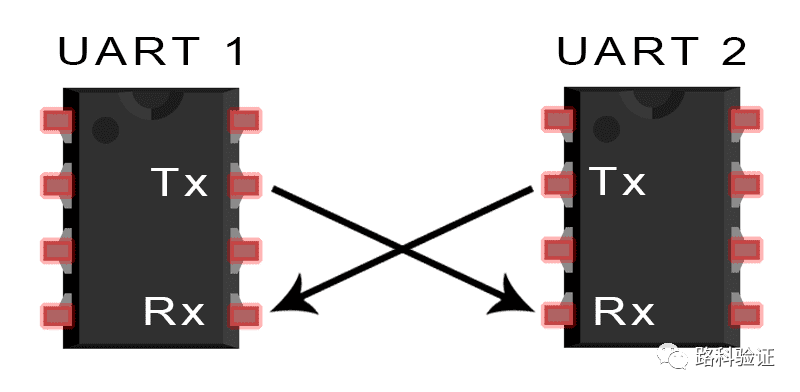 在UART通信中,两个UART直接相互通信。发送UART将来自控制设备(如CPU)的并行数据转换为串行形式,以串行方式将其发送到接收UART,然后由接收UART将串行数据转换回并行数据以用于接收设备。只需要两条线即可在两个UART之间传输数据。数据从发送UART的Tx引脚流到接收UART的Rx引脚: