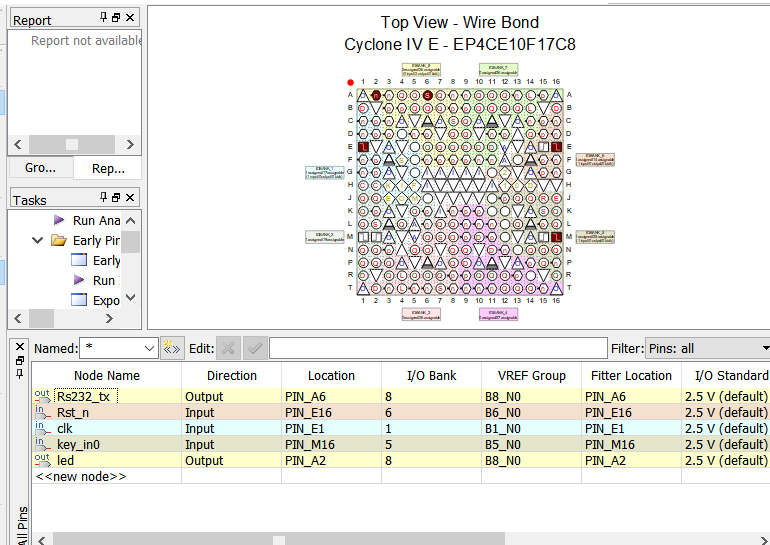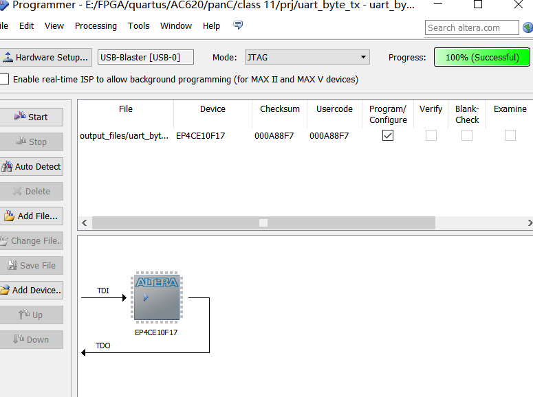 在Quartus II中,使用In system sources and probes editor工具,输入需要通过串口发送出去的数据,然后按下学习板上的按键0,则FPGA自动将所需要发送的数据发送出去。