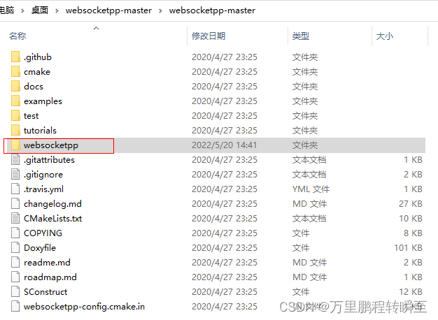 下载解压后得到一下目录结构,其中websocketpp就是我们所要用到的库文件,examples下有一些websocket的基本使用案例。