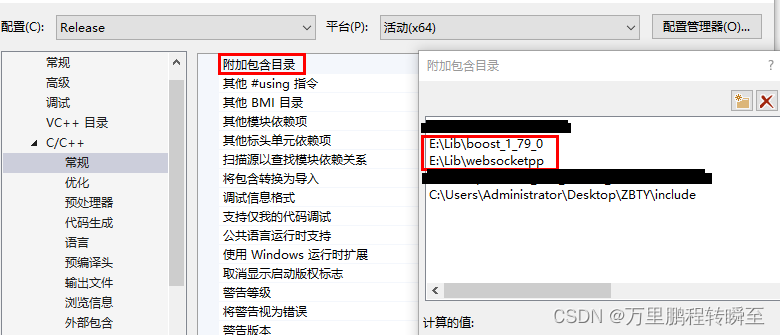 就是在配置boost项目上卡了博主很久,因而才有意写这个博客。boost与websocketpp两个库都是hpp的源码,不需要太多的配置,只需要在附加包含目录里引入两个路径即可(确保include可以正常导入库文件)。一定要切记:boost要最先导入,否则,会有各种莫名其妙的报错。