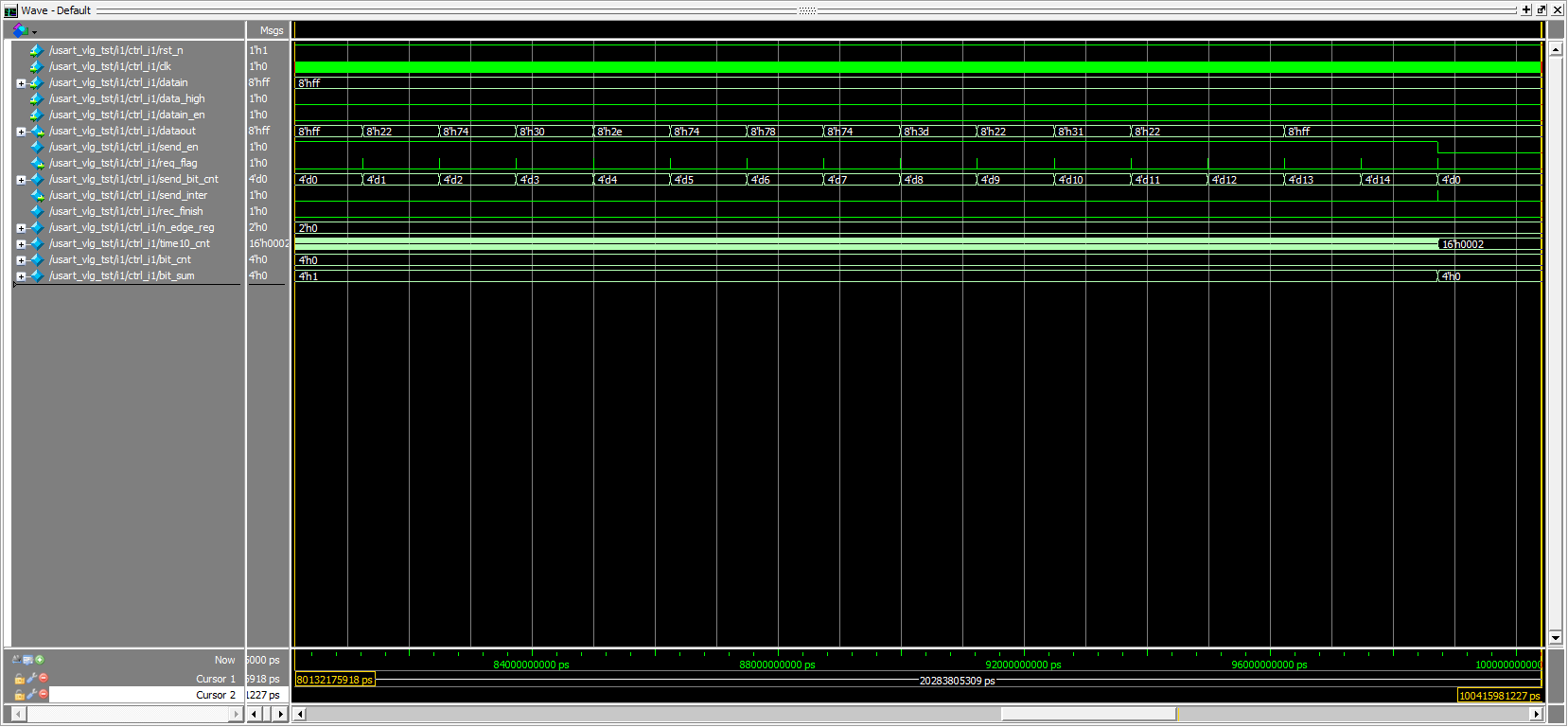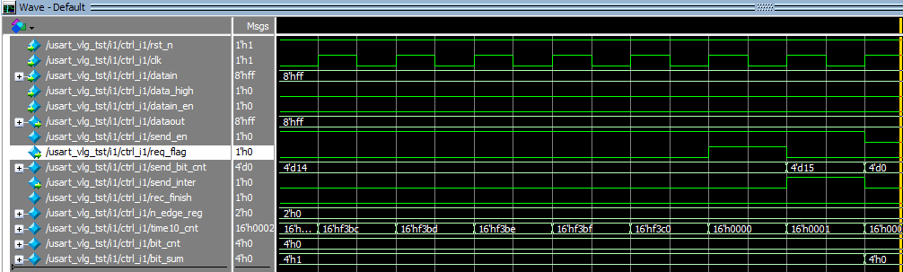 这是改进后(send_bit_cnt == NUM_CHAR + bit_sum时才将send_en置0,明显的延后一个时钟周期),开始时是send_bit_cnt == NUM_CHAR + bit_sum – 1,其实开始这样写是合情理的,因为定义的数组是从下标0开始的,发送也是从0下标开始,这样按照计数的个数(即从0开始算)发送的话,那么对应数字的话应该是要减1的,但很明显,如果用最开始减1的写法,最后FF的请求脉冲就会少一个,只有换成send_bit_cnt == NUM_CHAR + bit_sum后,如上图也可知,在send_bit_cnt==15的时候,也只持续了一个时钟周期,这样既不会多增加req_flag,又能将少发的FF增加。由上知,这个1很关键。