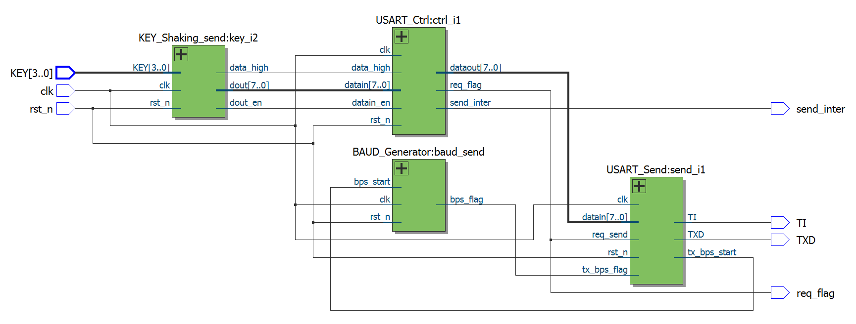打完收工。。。这里给出整个FPGA串口发送字符串指令控制HMI串口屏在其上显示1的的代码的RTL视图如下:各个模块都在我的博客中进行了说明