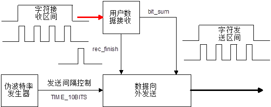 解释一下,data_high&&datain_en表示在接收区间内由数据到来,当数据到来时,将数据写入到Memory中,另一方面bit_sum用来计接收的总字符个数,以方便发送部分准确的将数据顺序移位输出,其次,在接收完成时(判断data_high的下降沿),置位send_en,程序调度进入发送区间,最后将字符从dataout送出。