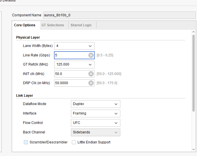 GT Selection -> Lanes = 1;RefClk=GTPQ0选择高速接口数量和参考时钟,这部分设置芯片有专用管