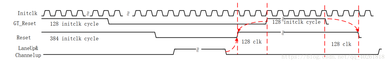 上电后GT_Reset和Reset同时复位,GT_Reset提前128clk退出复位,当LaneUp&ChannelUp出现下降沿后