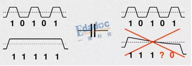 大家看明白了吧,由于我们的串行链路中会有交流耦合电容,我们知道理想电容的阻抗公式是Zc=1/2πf*C,因此信号频率越高,阻抗越低,反之频率越低,阻抗越高。因此上面的情况,当码型是高频的时候,基本上可以不损耗的传输过去,但是当码型为连续“0”或者“1”的情况时,电容的损耗就很大,导致幅度不断降低,带来的严重后果是无法识别到底是“1”还是“0”。因此编码就是为了尽量把低频的码型优化成较高频的码型,从而保证低损耗的传输过去。