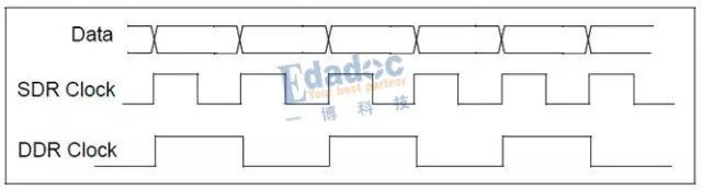 我们还是来看看典型的例子吧,图中所示的时钟可以是单数据速率(SDR)或双倍数据速率(DDR)的时钟,如下图所示。SDR就是接收芯片在SDR时钟的每个上升沿(或每个下降沿)捕获数据; 而DDR则是接收芯片捕获DDR时钟的每个边沿(上升沿和下降沿)的数据。