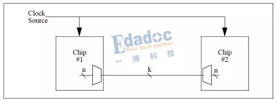 源同步要解决的第一个问题是减少在芯片之间传输数据所需的I/O引脚数量。这通过将芯片#1的输出处的n位数据复用到k位互连(k <n),然后将芯片#2的输入上的互连的k位解复用到n位内部数据路径上来实现,如下图所示。所得到的系统只需要每个芯片上的k个I/O引脚,而不需要先前的n个引脚。