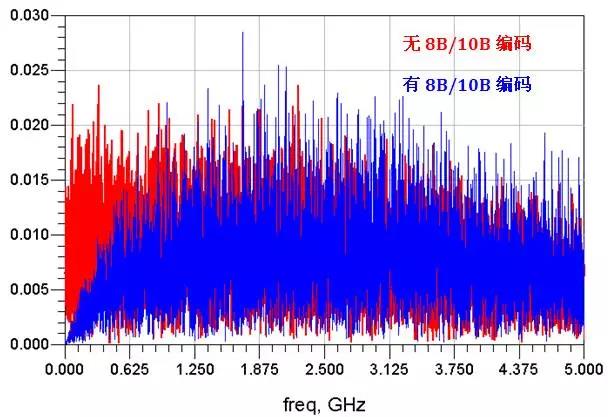 可以看到,进行8B/10B编码后,信号在低频段的能量明显少了,补充到了高频能量中去了。其实,这就相对于一个高通滤波器,根本作用和之前说的加重均衡时一样的,就是使经过传输通道后保持平坦的频域曲线,这样能有效缓解ISI码间干扰,使接收眼图扩大。所以说,使眼图变好的方式有很多,但是万变也不离其中,原理都是殊途同归的。