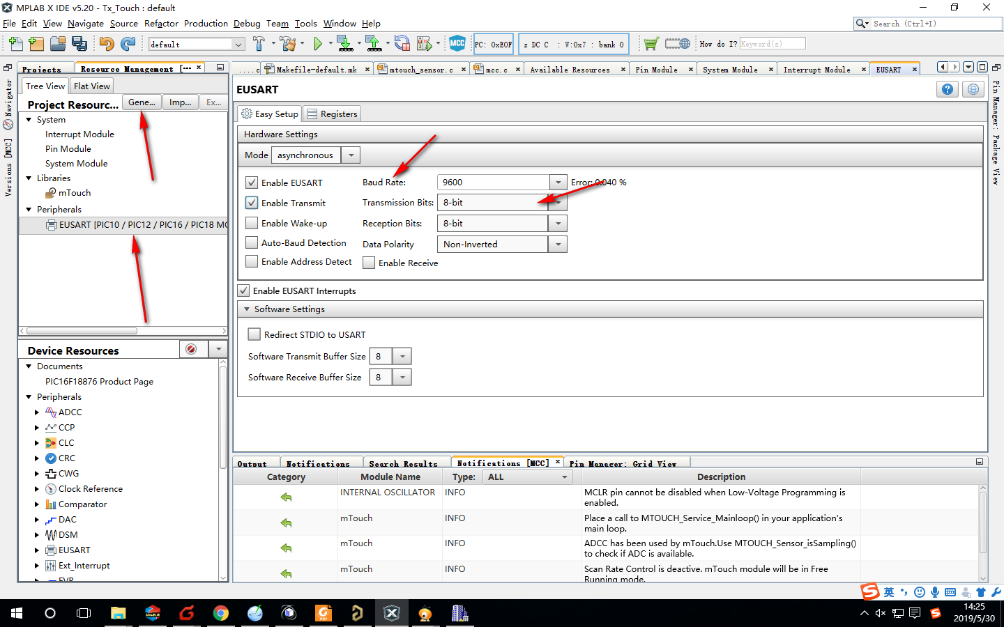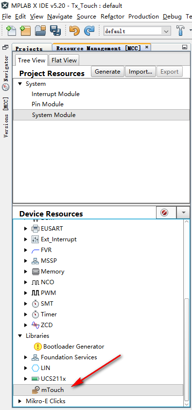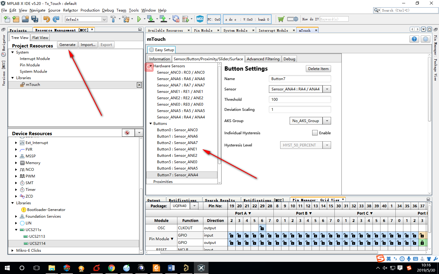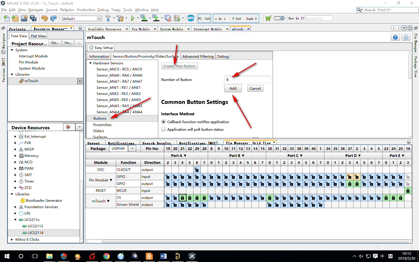 以上就是雪白台灯最近收集整理的关于【触摸按键识别】MCC配置(四)1、如图打开MCC2、如图选择配置系统参数3、双击mtouch打开如下界面按下图数据配置端口,因为在硬件设计我们知道触摸输入口有RC0 RA6 RA7 RE2 RE1 RE0 RA5 RA4这8个口,将这几个口锁住(绿色),如下4、ButtonsàCreate New Button,填8个,最后点击Add5、选择对应的IO口6、以上完成后,点击Generate生成代码7、为了将触摸信号显示在PC上,本人多配置一个USART,波特率9600,当然这个不是必须的。配置的全部内容,更多相关【触摸按键识别】MCC配置(四)1、如图打开MCC2、如图选择配置系统参数3、双击mtouch打开如下界面按下图数据配置端口,因为在硬件设计我们知道触摸输入口有RC0内容请搜索靠谱客的其他文章。