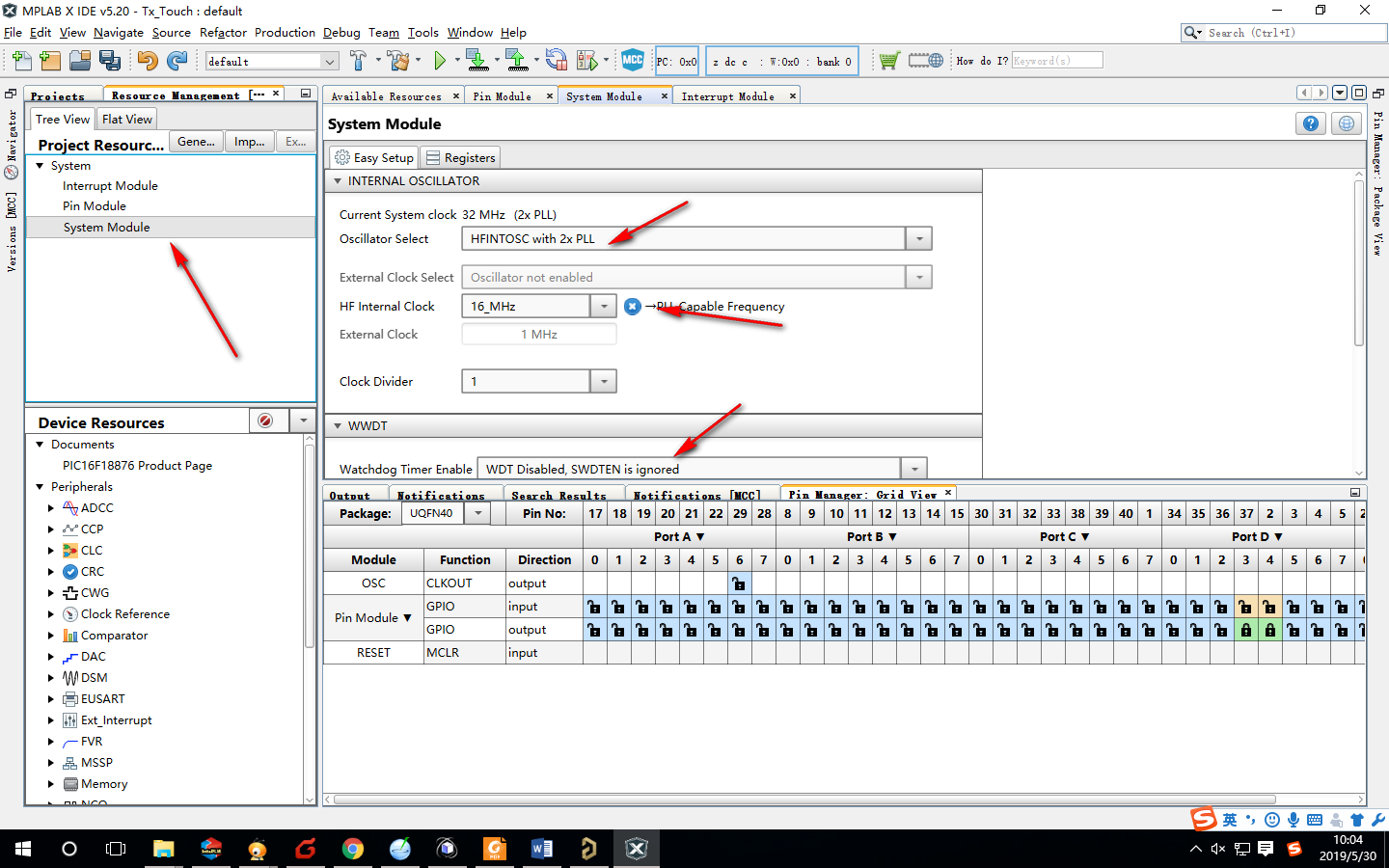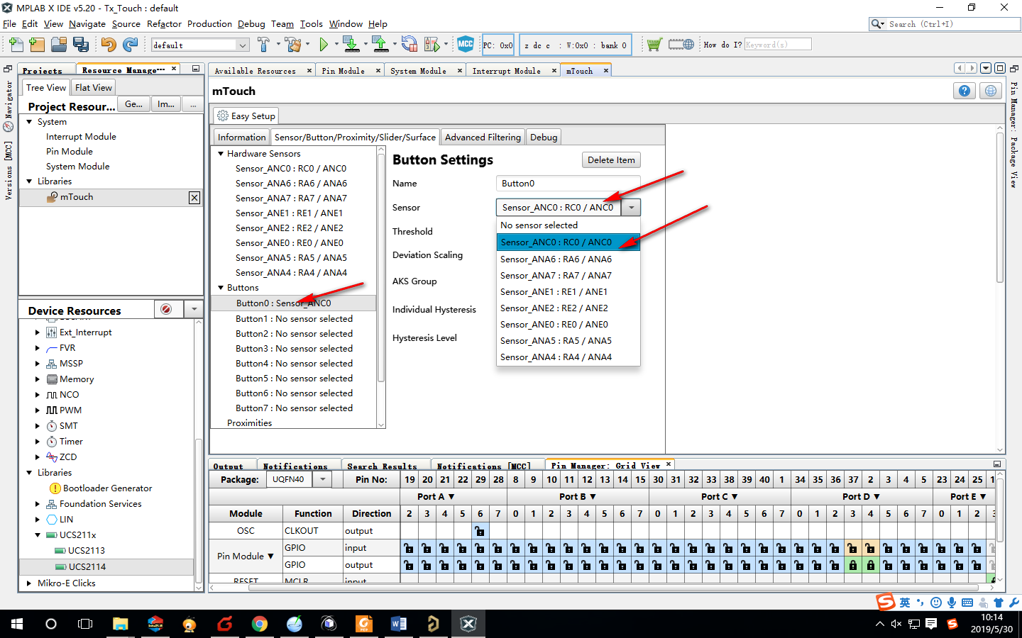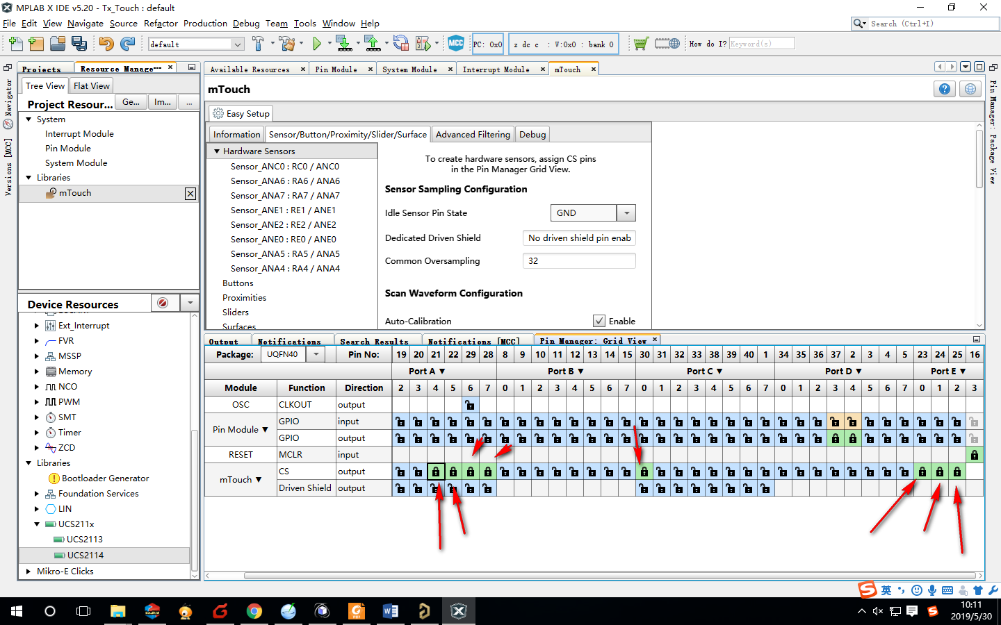 按下图数据配置端口,因为在硬件设计我们知道触摸输入口有RC0 RA6 RA7 RE2 RE1 RE0 RA5 RA4这8个口,将这几个口锁住(绿色),如下