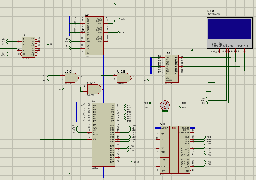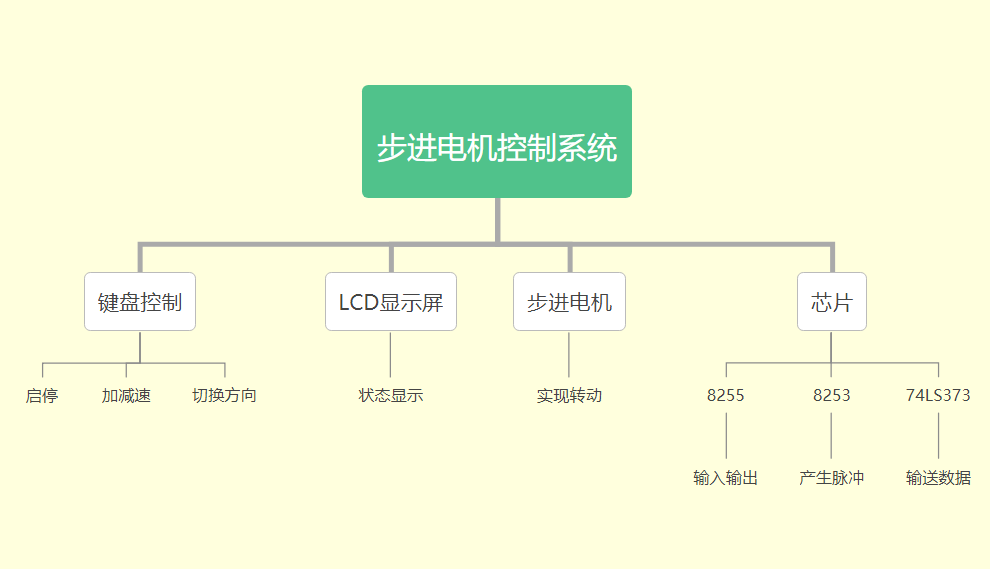 步进电机控制系统将4*4键盘作为输入端口,从键盘读取命令后,通过8255A口输出,以使步进电机转动,电机转动频率由8253的输出脉冲提供。电机转动后,74LS273向LCD输出,使LCD显示步进电机的工作状态。按下1-9键可实现不同挡位之间的切换,按下A和B键可实现电机转动方向的切换,按下C键可使电机停止转动,按下D键可使LCD清屏。