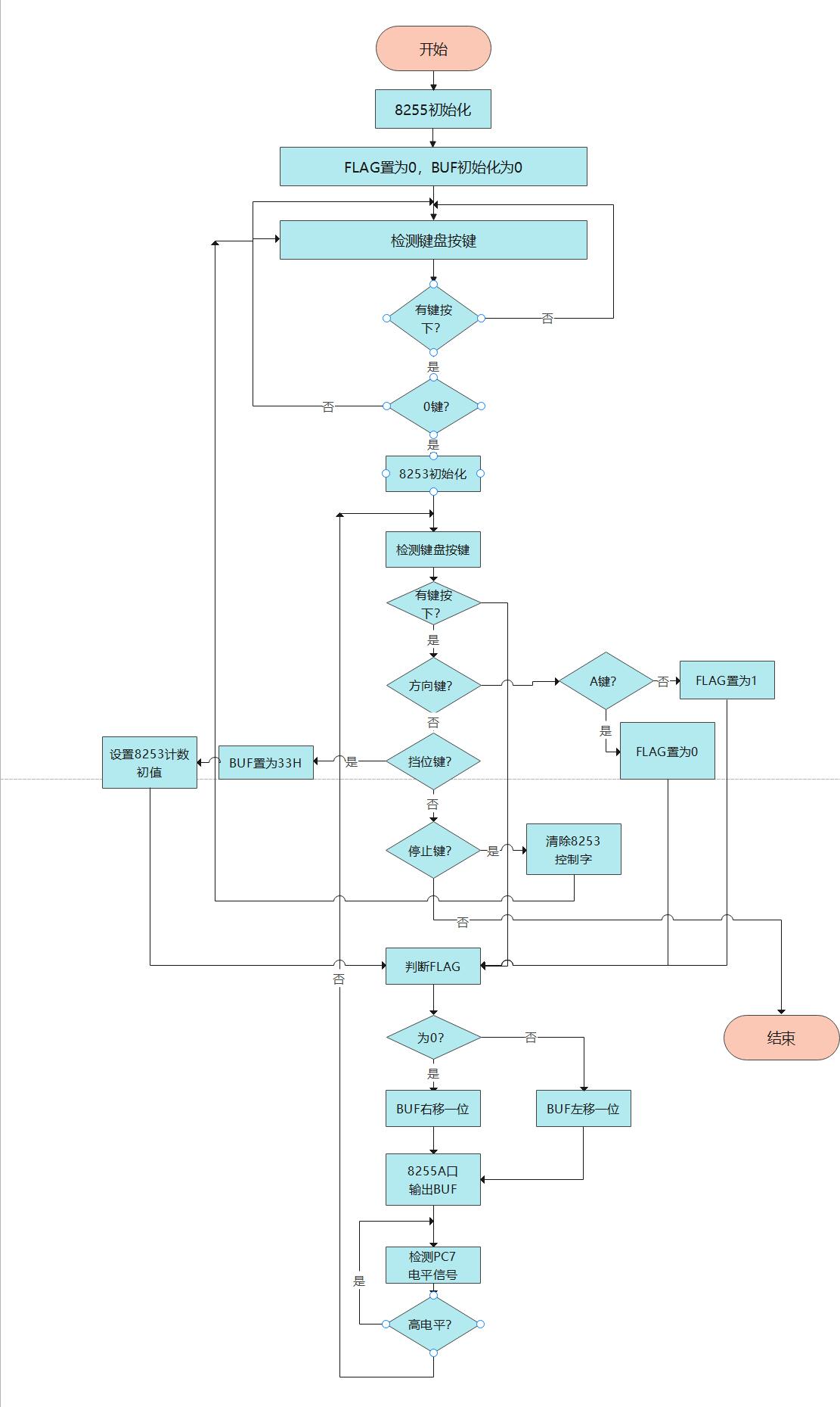 本实验旨在实现用键盘实现对步进电机更加精准的控制。首先启动系统对8255初始化,设置FLAG标志,用来选择转动方向(开始把FLAG置为0,默认逆时针转动)然后测试是否有键按下,当0键按下时,对8253初始化,输入控制字,选择通道0和通道1,两个通道级联,并且都选择方式3,然后对两个通道设置计数初值。当按下1-9键时,将BUF置为33H,使得步进电机能够转动起来,然后重置两个通道的计数初值。1-9键对应不同的计数初值,使得8253能产生各种不同频率的脉冲。接着8255A端口输出BUF使步进电机启动。每转动一步74LS273就向LCD输出数据,使LCD显示步进电机的当前工作状态。然后测试是否有键按下,如果按下挡位键则可以通过向8253重置计数初值实现换挡,按方向键之后可以实现转动方向的切换。当按下C键时,清空8253控制字,电机停转。按下D键时,LCD清屏。