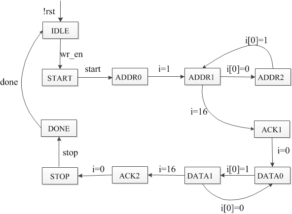由图4可知,IIC发送数据的过程包括以下步骤:1、主控器发送开始信号—>2、主控器发送8位命令—>3、被控器应答—>4、主控器发送8位数据—>5、被控器应答—>6、主控器发送结束信号(如果还有数据要发送只需继续重复步骤4和5,待所有数据发送完后执行步骤6)。因此,IIC协议发送过程有明显的先后顺序关系,可以使用状态机来描述数据发送的整个过程。