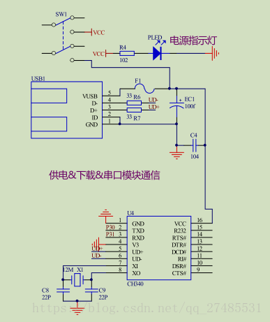 当开关SW1按下之后,经过USB1再连接一个USB转异步通信串口芯片CH340,使计算机通过USB来与单片机进行通信。